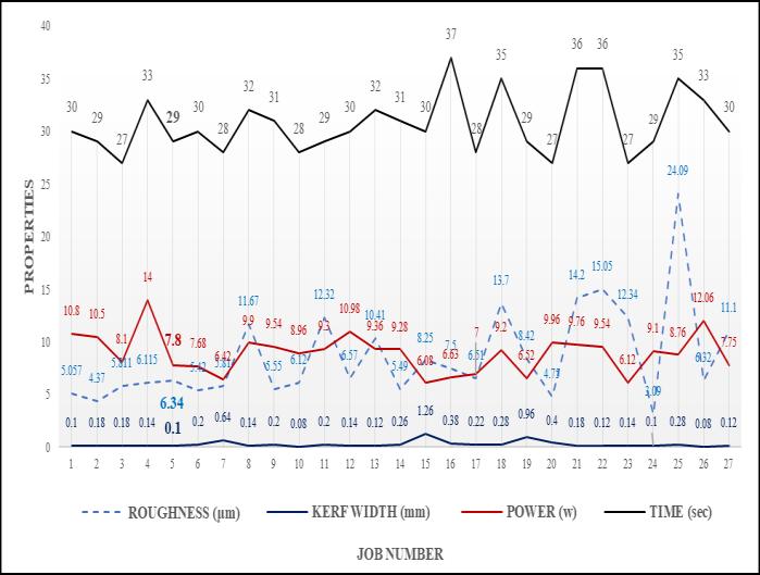 According to the variation in process parameters like cutting speed, stand-off distance and gas pressure, values of properties i.e. production time, power consumption, kerf width and surface roughness were recordedinthetable3 Aftermeasuringalltheproperties, comparative analysis was carried out to determine the optimum process parameters while making a job on laser cuttingmachine.Analysiswasperformedforfourdifferent measured properties by making a graph of all properties againstthejobnumber.
