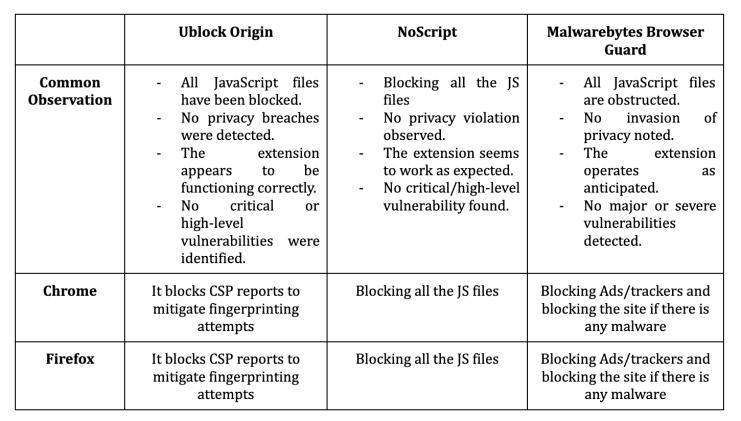 The audit study investigated the effectiveness of the privacy-preserving nature of the three popular privacypreserving extensions Ublock Origin [5], NoScript [4], andMalwarebytesBrowserGuard[6].Ouranalysisresults confirm that all three extensions are effectively blocking javascript, which is a common vector for web-based threats. Study also support that, none of the extensions were found to breach privacy or exhibit vulnerabilities at criticalorhighlevels.