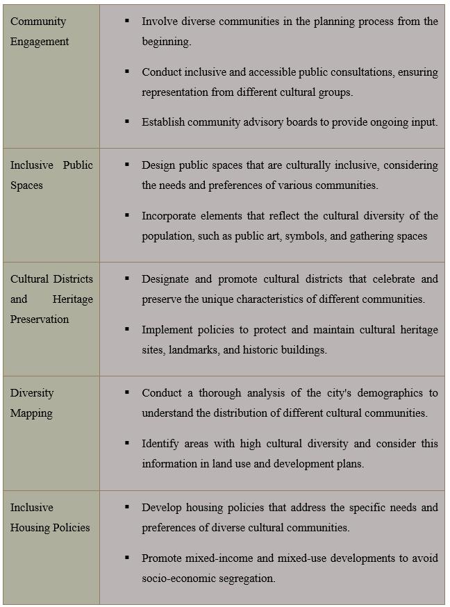 In conclusion, urban planning in multicultural cities is a dynamic and essential process that shapes the physical, social, and cultural fabric of urban environments. The strategies employed to address the needs of diverse communitiescontributetothecreationofinclusive,vibrant, and resilient cities. Through inclusive zoning, cultural competence training, and community engagement, urban plannerscanfosterasenseofbelongingforresidentsfrom differentculturalbackgrounds.Thepreservationofcultural heritageandthecreationofculturallysensitivepublicspaces contribute to a city's unique identity and promote social cohesion.