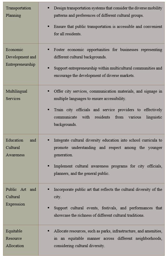Public art, cultural events, and expressions of identity in urbanspacesnotonlybeautifythecitybutalsoserveasa testamenttothecelebrationofdiversity.Equallyimportant are educational programs that promote cultural understanding and awareness, fostering a sense of unity among residents. By prioritizing the needs of all communities, urban planners can contribute to the development of cities that are not only physically well-