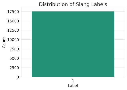 For slang detection, the BERT model achieves a high accuracy of 98% in identifying slang usage in sentences. However, the single-class nature of the dataset limits the