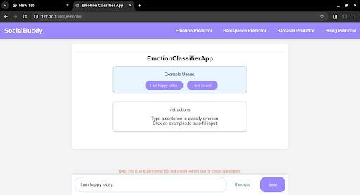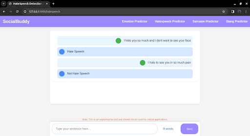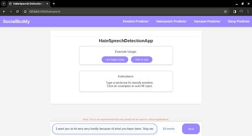 Thehatespeechclassificationappshowcasesthemodel's abilitytoidentifyhatespeechinreal-worldscenarios.The app accurately detects instances of hate speech and provides explanations for its predictions. The results underscore the model's potential in moderating online contentandcreatingsaferonlineenvironments.
