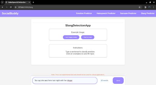 The slang detection app demonstrates the model's ability to identify slang usage in real-world sentences. The app accurately detects instances of slang and provides the corresponding slang words. However, the app's effectiveness in sentiment analysis is limited due to the single-classnatureofthetrainingdataset.