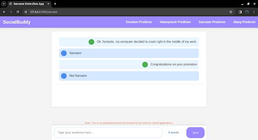 Thesarcasmdetectionapphighlightsthemodel'sabilityto identify sarcasm in real-world tweets. The app accurately detectsinstancesofsarcasmandprovidesexplanationsfor its predictions. The results demonstrate the model's effectiveness in capturing the subtle nuances and contextualcuesassociatedwithsarcasm.