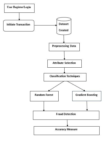 Initially,transactiondataiscollectedfromvarioussources such as online platforms, this raw transaction data then undergoespreprocessing,whereitiscleansed,normalized, and enriched to ensure consistency and quality. Once the data is prepared, it is fed into the fraud detection system, wheresophisticatedalgorithmsanalyzetransactionpatterns and behaviors to identify potentially fraudulent activity. These algorithms leverage features such as transaction amount, frequency, location, and user behavior to distinguishbetweenlegitimateandfraudulenttransactions. Thereal-timemonitoringcomponentscontinuouslymonitor transaction streams for any anomalies or suspicious patterns.Ifatransactionisflaggedaspotentiallyfraudulent, it is routed to an alerting system, which notifies relevant stakeholdersforfurtherinvestigationorintervention.
