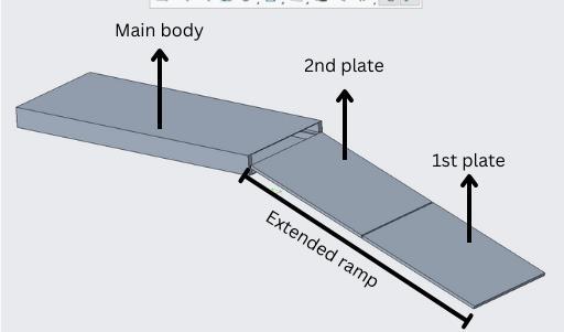 Threeprimarystructuralpiecesandafewauxiliarypartsfor thesestructuralelements'movementwillmakeuptheramp. Thesethreeparts,whicharethefirstplate,secondplate,and majorbody.Theramp'sfirstandsecondplatesaremovable partsthatmaybothglidelinearlywithinthemainbody.The rackandpinionmechanismthatmovesthefirstandsecond platesisacomponentofboththeprimaryandsecondplates. There are guideways to ensure that the plates slide smoothly. The pinion is installed on the motor, which is encasedinahousingthatisfastenedtothebarwithinthe mainplateandhingedtothesecondplate,inordertomove thesecondplate.Regardingthesecondsliding
