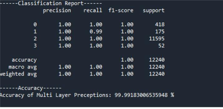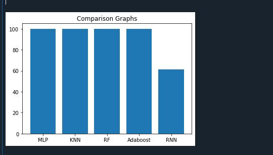 (e.g.,MLP, KNN,RF, AdaBoost) anddeep learning methods (e.g., RNN), are implemented. The results showcase accuracy, precision, recall. The output shows the graphical comparisons are drawn to evaluate the results of the algorithms.
