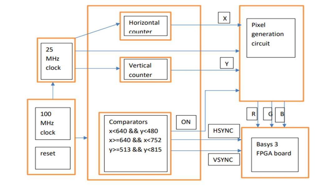 TheVGAcontrollerdesignfollowsamodularapproach,withtwomainmodules:`vga_test`and`vga_controller`.The`vga_test` moduleservesasthetop-levelmoduleandinstantiatesthe`vga_controller`module,whilealsoprovidingtheRGBcolorvalues fortheVGAoutput.The`vga_controller`moduleimplementstheVGAtimingandgeneratesthenecessarysynchronization signals.BlockdiagramisshowninFig-3.