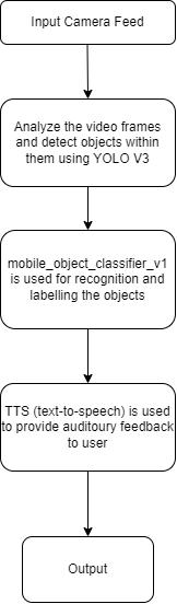 In the proposed system, the workflow begins with capturing a live feed from the device's camera. This live feed serves as the input for the object detection process. Once the camera feed is obtained, the YOLO V3 algorithm is utilized to analyze the video frames and detect objects withinthem.