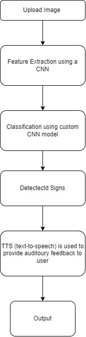Usersinitiatetheprocessbyselectinganimagecontaining atrafficsignfromtheirdevice'sfilesorgallery.Thisimage serves as the input for the traffic sign detection module. Our system employs a custom Convolutional Neural Network (CNN) model specifically trained for traffic sign detection. The CNN architecture is designed to extract intricate features from images and perform classification tasks accurately. The custom CNN model is trained on a meticulously curated dataset comprising images of traffic signsbelongingtofiveclasses:"fifty,""left,""right,""stop," and "thirty." This dataset includes diverse examples of each class to ensure the model's ability to generalize and accuratelyclassifytrafficsignsinvariousconditions.Upon uploading an image, the custom CNN model performs feature extraction by analyzing the image's pixel values. The convolutional layers of the CNN identify and extract relevant patterns and features indicative of traffic signs. Subsequently, these features are passed through the classification layers of the CNN, where the model assigns probabilitiestoeachclassbasedonlearnedfeatures.After feature extraction and classification, the system determinesthedetectedtrafficsignbyanalyzingtheclass probabilities assigned by the CNN model. The class with the highest probability is selected as the predicted traffic sign. Once the traffic sign is identified, the system generates output in audio form using Text-to-Speech (TTS) technology. The detected traffic sign's label (e.g., "fifty," "left," "right," "stop," or "thirty") is converted into synthesized speech by the TTS engine. The synthesized speech, containing the label of the detected traffic sign, is delivered to the user as auditory feedback. This auditory feedback mechanism ensures that users receive essential information about the detected traffic sign audibly, enabling them to stay informed and make informed decisionswhilenavigatingtheirenvironment.