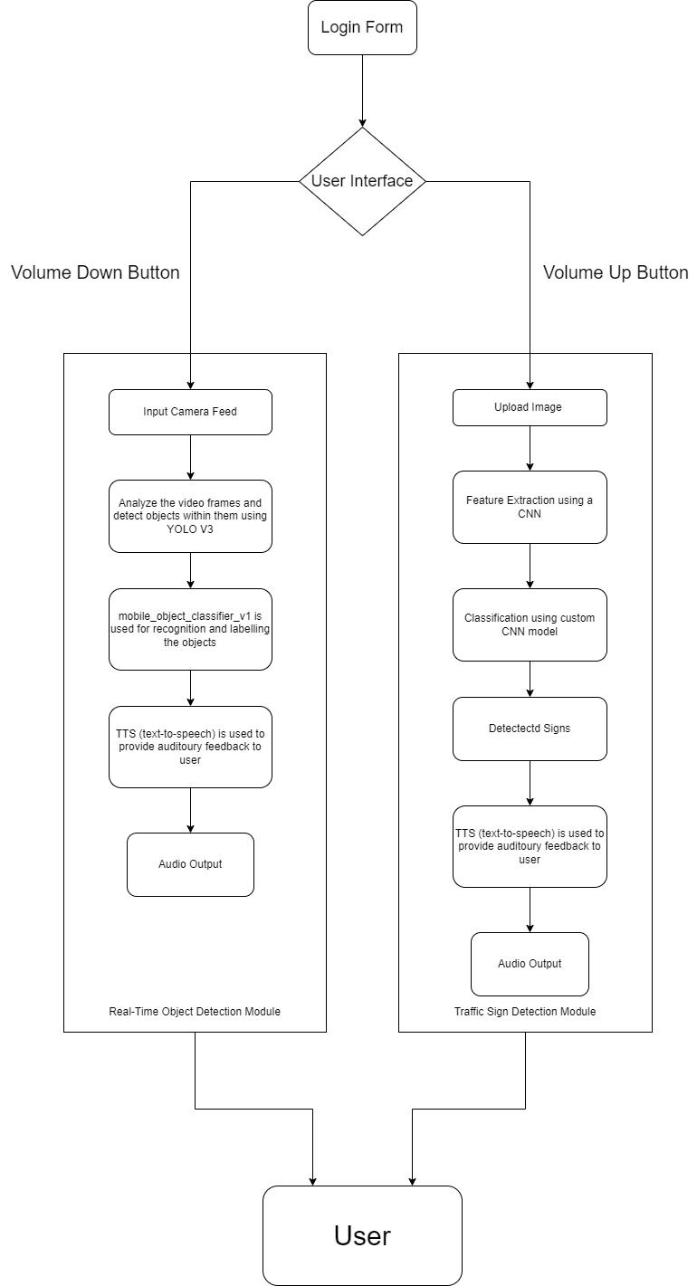A crucial part of urban navigation for visually impaired peopleiscomprehendingandinteractingwithtrafficsigns, which is covered in detail in the second aspect. Users can upload images from their gallery for analysis using this feature, unlike real-time object detection. After that, the application finds any traffic signs in these pictures and plays audio descriptions of them. This ability is especially helpful for understanding complicated crossroads, creating route plans, and improving mobility in general when outdoors. The creation of this application marks a substantial advancement in the integration of artificial intelligence, computer vision, and auditory feedback to make the world more approachable and comprehensible for people with visual impairments. With an emphasis on immediatesupportandin-depth examinationofuploaded photos,theapplicationprovidesaflexibletoolthattackles a variety of issues that its users encounter daily. This introduction lays the groundwork for an in-depth examination of the development of the application, covering everythingfrom thetechnical implementation to the user-centered design and conceptual foundations. It seeks to demonstrate the possibilities for these cuttingedge applications to improve visually impaired people's mobility and safety while also giving them more independence and opportunities to interact with their surroundings.