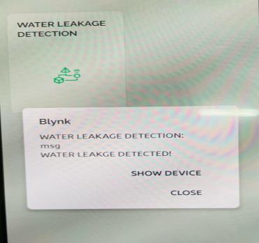 6. Theuserwillthenreceivethe alertmessageinblynk app when leakage is detected with the assistance of Wifimodule