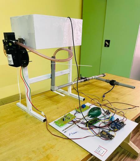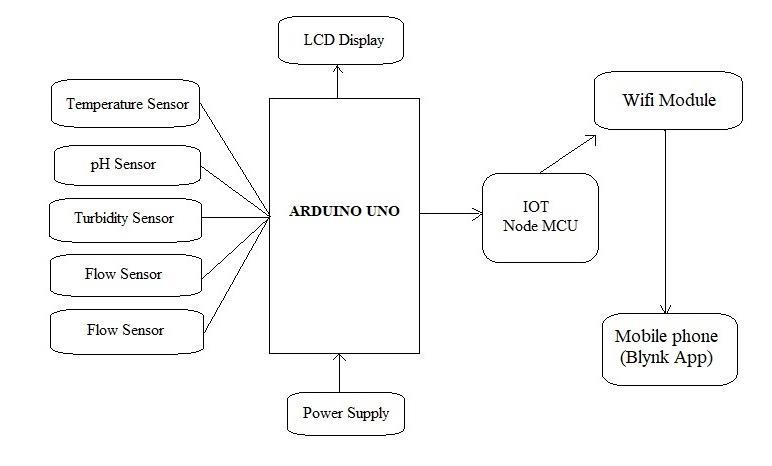 Here, analog signals from the temperature, pH, turbidity, and flow sensors are sensed from the water supply and senttothemicrocontroller.Theseanalogimpulsesarefed into the ArduinoUNO, whichtransforms them intodigital