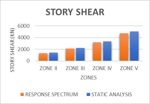 Higherzonesexperiencegreaterseismicforces.According totheinvestigation,whentheseismiczonecategorization moves from lower (Zone II) to higher (Zone V), seismic forces such as base shear, story shear, and story drift increase dramatically. Forces and displacements may be overestimated by static analysis. Static analysis often forecastsgreatervaluesforstoryshears,displacements,and taledriftsthroughoutallseismiczoneswhencomparedto reactionspectrumanalysis(dynamictechnique).Accurate forecastingrequiresdynamicanalysis.Notableexpansion between neighboring seismic zones. Moving from one seismiczonetothenexthigherzoneresultsinanoticeable increase in seismic demands (base shear, story shear, displacement, and drift), according to the analysis. These characteristicstypicallyrisebybetween50and60percent betweenneighboringzones.