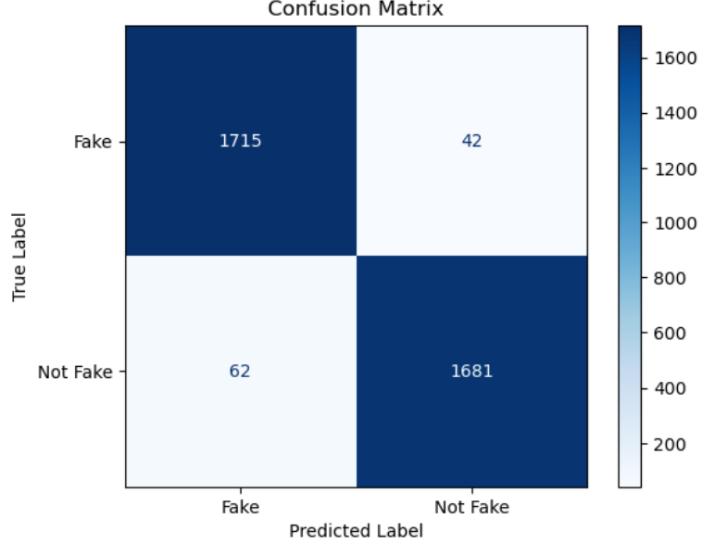The confusion matrix shows the performance of our model classifying news articles as real or fake. The text labels on the axes indicate the Fake or Not Fake(True) labels. The values in the table represent the number of news articles thatfallintoeachcategory.