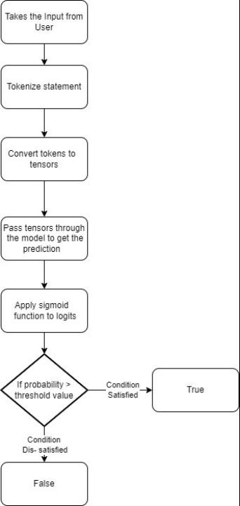 When the program starts the user will give an input statementandthestatementispassedontothemodel.The modelwilltokenizethestatementintowordsorsub-words. These tokens are then converted into Tensors, which are multi-dimensional vectors. These Tensors are then passed into the model, which must predict the probability. To do this, the model converts the Tensors into Logits, commonly usedinmachinelearning,particularlyinclassificationtasks. The logits will then be given to the Sigmoid function which will give the output as probabilistic value. After setting a Threshold Value the model will compare it with the probabilityandreturntheoutput.