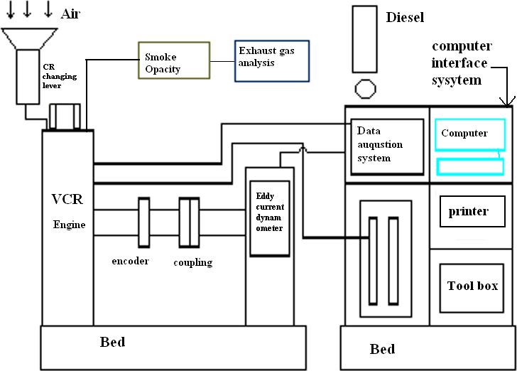Experimentations were carried out on a single cylinder watercooled fourstrokevariablecompressionratio(VCR) dieselengine.Figure3.1representstheschematicdiagram with different components present in it. The engine is tested at different compression ratios varying from 16 to 18.5withanincrementof0.5by maintainingfixedrpmof 1500. Eddy current dynamometer is used for loading purpose, parameters like cylinder peak pressures, brake thermal efficiency and brake specific fuel consumption weremeasured.