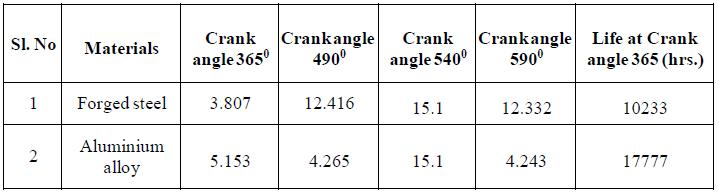 The stress analysis was carried at critical angles of 3650 , 4900,5400 and5900 withdifferentloadingconditionsata constant compression ratio of 16.5. The results obtained from the structural analysis shows that the stresses induced at the crank pin and bearing supports in the aluminum alloy (7075-T6) are lesser in comparison with AISIE4330forgedsteel fordifferentcrank angles.Forthe above crank angles, structural analysis was done using ANSYS and the results show that the stresses and total deformation are more at crank pin than at bearing supports. The analytical and ANSYS results were compared for both the materials. It was found that the variationinthestressvaluefortheAluminiumalloyisless than 1% and for the forged steel is less than 5%. The simulation performed is in very good agreement with the analytical results.