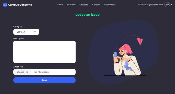 The "Campus Concerns" project introduced here aims to promote transparency, accountability, and efficiency in addressing student grievances, thereby contributing to a more positive and constructive learning environment. By harnessing the power of modern technology and streamlining workflows, this system not only simplifies thegrievancemanagement process butalsofacilitatesthe creation of a more supportive and conducive educational setting.