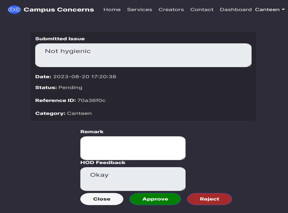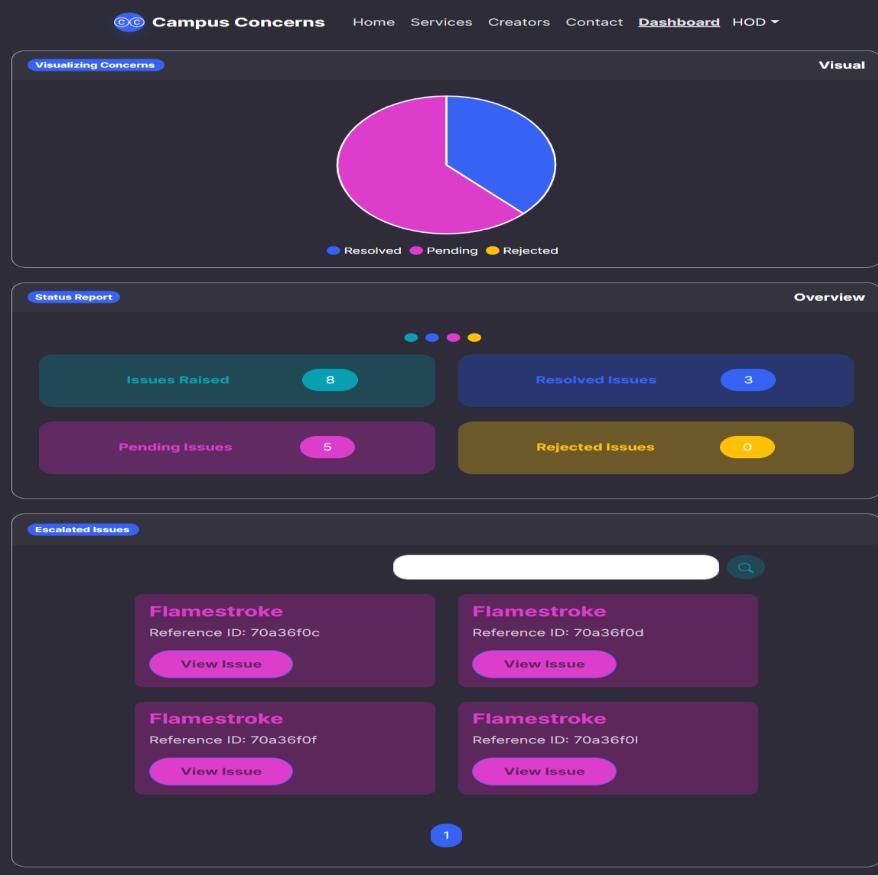 This is the HOD portal where HOD can view all concerns. Number of concerns which are rejected, approved, pendingcanbeviewedbyusingapiechart.