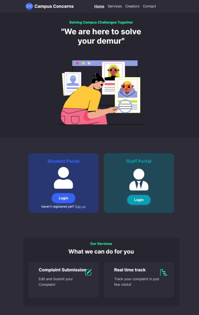Developed the Campus Concerns website using Bootstrap for responsive design and HTML/CSS for front-end development.