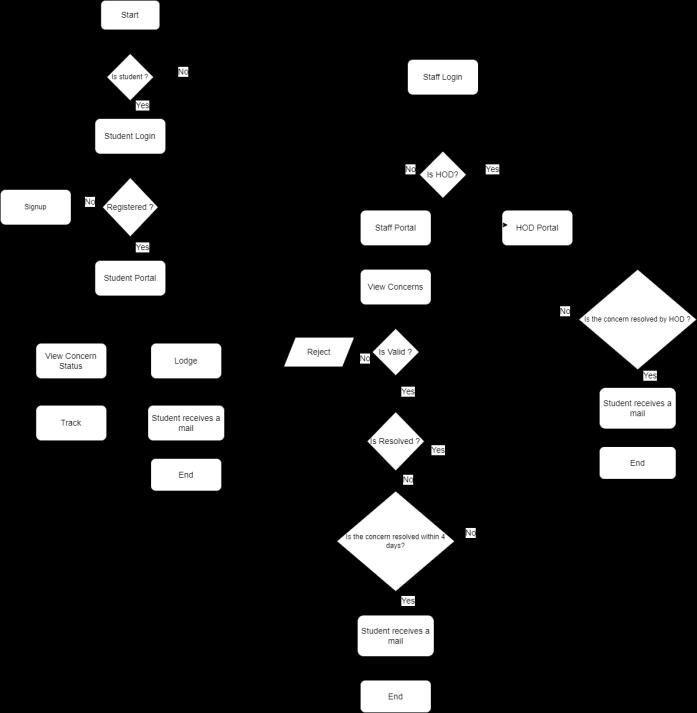 Figure 4.1 portrays the framework/flowchart of Campus ConcernsandFigure4.2and4.3showtheworkflowofthe projectfromstaffsideandstudentsiderespectively.
