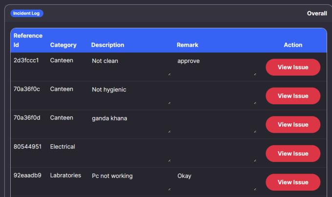 Upon successful profile registration, a student can raise an issue from their profile. Subsequently, the assigned staff member will receive an email notification. Upon reviewing the issue description, the staff can either approveorrejectit.Studentshavethecapabilitytotrack their grievances using a uniquely generated Reference ID.Iftheconcernorfeedback remainsunansweredafter 4 days, it will be escalated to higher authorities through email.