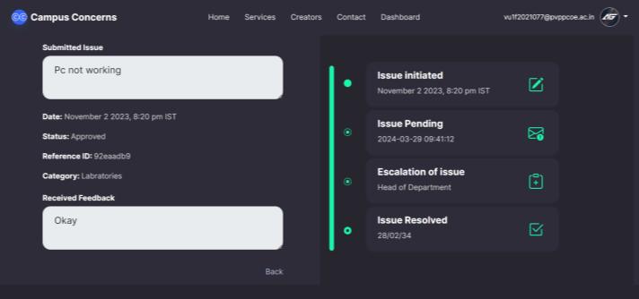 Abstract- This paper introduces the Campus Concerns System, a comprehensive web-based solution designed to optimize the management and resolution of issues within educational institutions. The system prioritizes efficiency and user-friendliness, providing students with a seamless platformtosubmitgrievances,enablingfacultyandstaffto manage concerns effectively, and offering administrators tools to monitor and analyze feedback trends and trajectories. The Campus Concerns initiative aims to enhance transparency, accountability, and efficiency in addressing student concerns, fostering a positive and constructivelearningenvironment.Byharnessingmodern technology and streamlined workflows, the system facilitates improved communication between faculty and students. Beyond being an issue portal, Campus Concerns serves as an effective platform to enhance the overall college/school environment. Notably, the system enables students to monitor the progress of their raised issues or feedback in real time, offering insights into how their matters are being handled and whether relevant authorities have reviewed the concern. To further prioritize responsiveness, if a student does not receive a reply to their raised issue/feedback within four days, the system automatically escalates the matter to higher authorities.