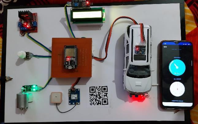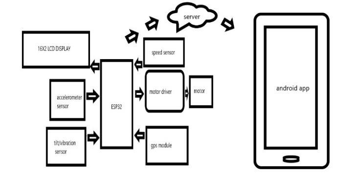 TheESP32isatthecenterofthesystemandisconnected to various sensor that perform different functions. The first is the LCD display, which shows the sensor values in real- time. Thedisplay is connected to theESP32 through the I2C interface. The second is the GPS module that retrieves the location of the vehicle. The GPS moduleis connected to the ESP32 through the serial interface. The third sensor includes the accelerometer sensor, tilt vibration sensor, and speed sensor.These sensors detect any sudden changes in speed, direction, or tilting of the vehicle. Theaccelerometersensorandtiltvibrationsensor are connected to the ESP32 through the ADC interface, whilethespeedsensorisconnectedtotheESP32through the GPIO interface. The fourth includes the motor driver that controls the motor. The motor driver is connectedto theESP32throughthePWMinterface.TheESP32sendsa