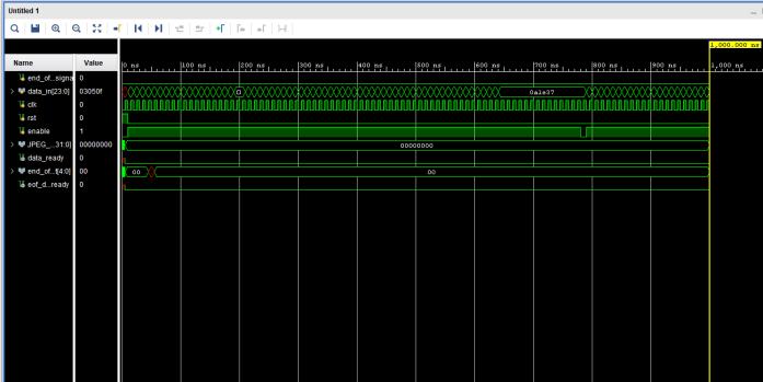 Thetop-levelmodule,jpeg_top,managesaJPEGencoding core with minimal inputs: clock, enable, and reset lines. Whentheinitialpixel'sdataisreadyandstayshighduring each8x8pixelblock's64-clockcycleinput,theenablesignal is triggered. Following this input phase, there is no more data received for the minimum 33 clock cycles that the enablesignalremainshigh.Theenablesignalisthenquickly loweredforoneclockcycleandthenraisedonceagainfor thesubsequent8x8blockinput.Red,green,andbluepixel valuesarestoredonthe24-bitdatabus,withbluestoredin bits[23:16],greeninbits[15:8],andredinbits[7:0].Atthe firstclockcycleofthelast8x8block,theend_of_file_signal getshigh,signalingthatallofthebitsinthisfinalblockmust beproduced.Thebitstreamismanagedviathe32-bitoutput bus.