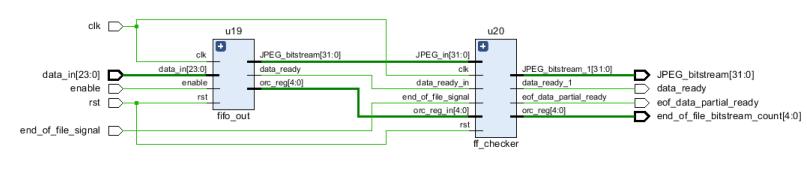 The JPEG bitstream is output via the 32-bit bus signal JPEG_bitstream. The first eight bits are located at [31:24], followed by the following eight bits at [23:16], and so on. When the data_ready signal is high, the data in the JPEG bitstreamislegitimate.Tosignalgenuinedata,data_ready will only be high for a single clock cycle. The signal eof_data_partial_readywillbehighforoneclockcyclewhen theadditional bitsare inthesignal JPEG_bitstreamon the lastblockofdataifthelastbitsdonotfillthe32-bitbus.The end_of_file_bitstream_count5-bitsignalindicateshowmany additionalbitsthereare.