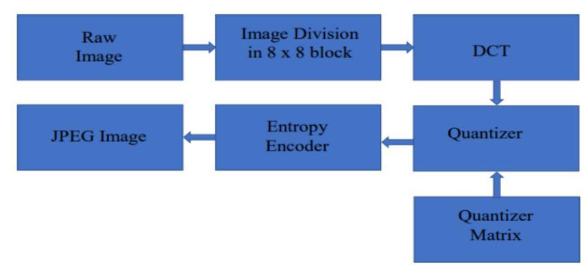 The raw image is divided into non-overlapping 8x8 blocks.These blocksareindependentunitsfor processing andanalysis.