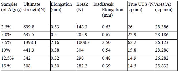 Tensile testing of MMC is conceded out on Tensometer machine. Tensometer is a device used to calculate the tensile properties of materials such as their Youngâs Modulus and tensile strength. Itâs a common testing machineloadedwithasamplebetweentwogripsthatare eitheradjustedmanuallyorautomaticallytoapplyforceto themodel.Themachineworkseitherbydrivingascrewor byhydraulicram.Testingisdonebyholdingthespecimen in the jaws of the Tensometer. The load is applied slowly and the material starts elongating. After the maximum loadreachedthespecimenbreaks