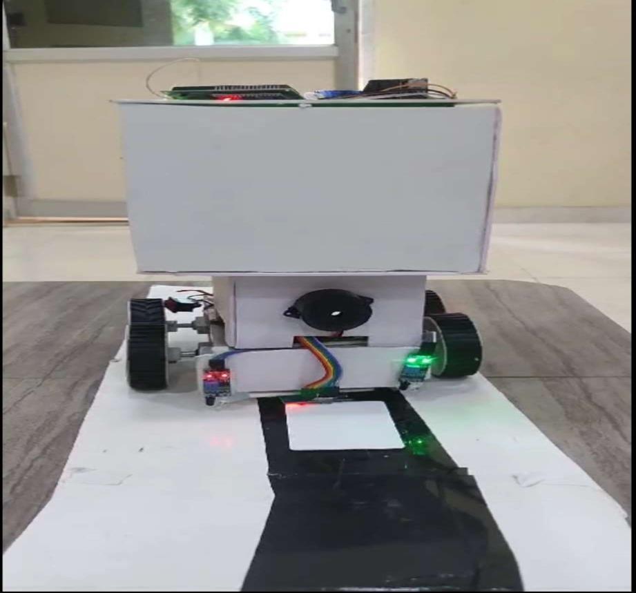 If the left and right infrared sensors are on top of white color,thenmovesforward.IfRightsensordetectsblackand theleftsensor detects none black line,then the robot will turnintherightdirection.Ifleft. Thesensordetectsblack andtherightsensordoesnotdetectsanyblackline,thenthe robotturnsleftdirection.IfbothIRsensorsdetecttheBlack linerobotmovementstops.Whenwesenddatato1robot goestoroom#1andidentifiestherfidtagatroomfromthe RFID reader present in it. The robot stops at room and makesabuzzingsoundandapersonintheroomshouldbe authorizedtocollectpapers.Ifthefingerprintcorresponds tothedatapresentinthefingerprintthemoduleopensthe box and the person can pick it up papers and boxes are automaticallyclosedafter2seconds.Afterpressingthereset button and entering data 2 to robot, goes to room #2 and processcontinues.