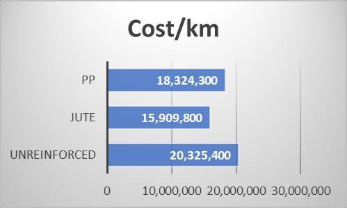 Thepercentagereductioninthecostofdesigninthecaseof subgrade reinforced with Jute fibre as compared to unreinforcedsubgradeis21.725%,whereasthereductionin thecaseofsubgradereinforcedwithPolypropyleneFibreis 9.845%.
