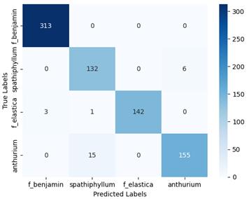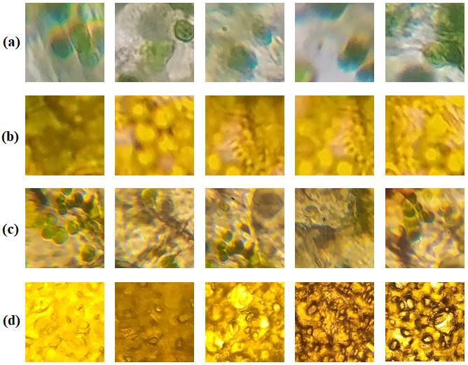 Microscopic cell images of ficus benjamin, spathiphyllum, ficuselastica,andanthuriumplantswereusedinthestudy. While creating the dataset, sections were taken from the leavesofeachplantinthestudyanddifferentimageswere obtained under the microscope using 40/0.65 - 160/0.17 objective zoom and 10x eyepiece size. After these images were taken with a high-resolution camera, sections with dimensions of 256×256 pixels were taken during the data pre-processing stage. The data obtained was used as 80% training data and 20% as test data to be used in machine learningmethods.Imagesofthedatasetusedaregivenin Figure1.