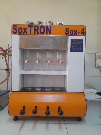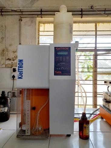 Add 0.55g of material to the instrument's digestion tube, followed by 25ml of concentrated H2SO4 and 1-2 catalyststabilisers.Adjustthetemperatureto370°Cand allow the solution to digest for 4-6 hours, or until it becomes blue. Remove the tube from the 0.1N H2SO4 solutioninatitrationflaskandplaceitonthedistillation unit.Attachatubeholdingdigestedsampletodistillation until the start button is pressed to effect a metered addition of NaOH. To initiate steam distillation, add 5 dropsofyellowcolour.Thisistheend.Nowfilltheburette with25mlof0.1NHCland0.1NNaOH.