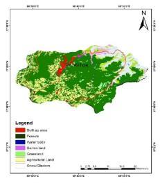 Environmentally regulated elements are thought to play a significantroleinthelikelihoodoflandslides.Anothercrucial environmental regulated influencing factor of the landslip thatavoidssurfacesoildeteriorationisthearea'sLU/LC(Fig. 6f).Landcoverisakeydeterminingfactorforslopefailure sincethemassmovementisbasedonthekindofland.The landuse/landcovermodelwascalculatedusingResourcesat imageswith2%cloudcover.ExilesENVIsoftwarewasused tocategorizethepictureintoseverallandusegroups(suchas forest,barren,grassland,waterbodies,andurbanland)after performingsupervisedclassificationwithanaccuracyof85.1 percent