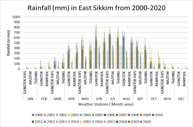 The study area geographically lies in the NE Himalayas of India,whichcoversanareaof964squarekilometerswitha populationof0.16millionsituated.IntheEastDistrict,679 squarekilometers,or71.17percentofthedistrict'stotalland area(964squarekilometers),arecoveredbyforests.Ofthe overall geographic area, very dense forest takes up 162 squarekm,denseforesttakesup396squarekm,andopen foresttakesup121squarekm.Hill,valley,andslopearethe three main physiographic units. Teesta, Rangpo Chhu, and Dik Chhu are the three main drainage systems in the East District.Elevationrangefrom246mto4625m(Fig.1).Mean average temperatures ranges between 22℃ to 36℃ in summer,while minus 04℃ to 07℃ in winter, withannual precipitationof100–900mm(Source:IMDdata)(Fig.2).The lithostatic units in the area are Kanchenjunga gneiss, Darjeeling gneiss, Chungthang schists and gneiss, Lingtse granitegneiss,andtheDalinggroupofrocks,whichincludes phyllite,slates,quartzites,andschistofPre-Cambrianage,are the five geological units found in the district (Source : GSI Report, 2020) . Alluvium quaternary deposits periodically formalongstreamsand rivers.Numerousfractures,faults, joints,folds,andotherstructuralanomalieshaveformedin therocksfoundinthedistrictasaresultofvariousstructural disturbances. Geological formations in the area show prominentlineamentsthatrunintheN-S,E-W,NE-SW,ENEWSW,andNW-SEdirections.