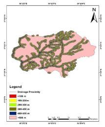 Distancetodrainage(Fig.6d)isdeterminedasasignificant influencing parameter in the slope failure because the proximitytoawaterbodyinaregionincreasesthelikelihood ofaslopefailurebyincreasingfluidporepressureandslope toeerosion[20,50].Duetotheruggedtopography,whichwas extractedusingCartosatDEMandthenreclassifiedinArcGIS 10.8, the research area includes a substantial drainage network.