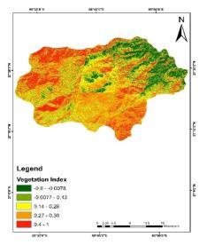 According to [52], NDVI is a significant environmental influencingelement(Fig.6i).Theplantdensityontheslope surface is measured using the NDVI. It is widely acknowledgedthattheadditionofgrassesandrootsplaysa significantpartinthestrengthofthesoil.AnNDVImapwas produced using multispectral Resourcesat satellite data to showthelocationanddensityofsurfacevegetation.
