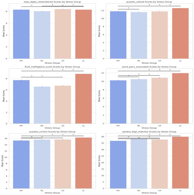The analysis of variance (ANOVA) was conducted to investigate differences in cognitive scores across the four stress groups, revealing significant disparities. This result underscores the critical roles that both the intensity and timing of stress play in influencing cognitive functions. Notably, the findings remained statistically significant even after implementing False Discovery Rate (FDR) corrections for multiple comparisons, highlighting the robust and substantial influence of stress on cognitive performance.
