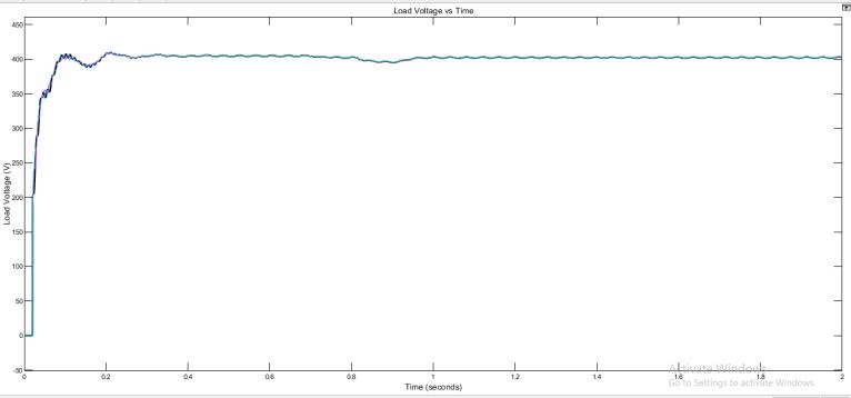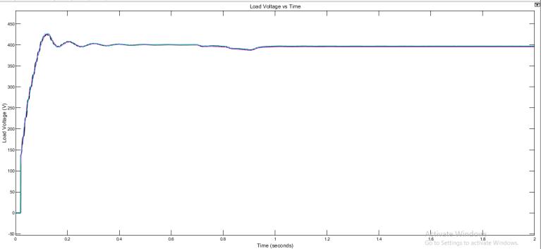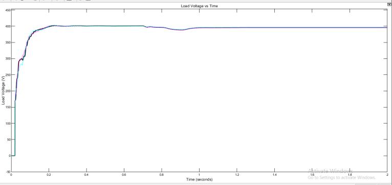 The rise time and settling time of for FLC controller is 0.09s and 0.23s along with load voltage is 398V as such steady state error is slightly reduced compared to PI showninFig10(b).