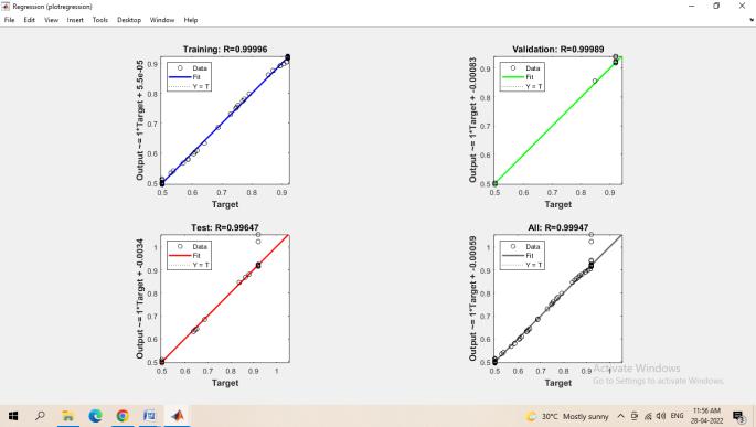 The figure 6 shows regression plots display the network outputswithrespecttotargetsfortraining,validation,and test sets. For a perfect fit, the data should fall along a 45 degree line, where the network outputs are equal to the targets. Figure 6 show the fit is reasonably good for all datasets,withRvaluesineachcaseisnearly1.TheMean Squared Error (MSE) is nearer to zero. Moreover the resultsofRshowANNcontrollertrainingismorestable.