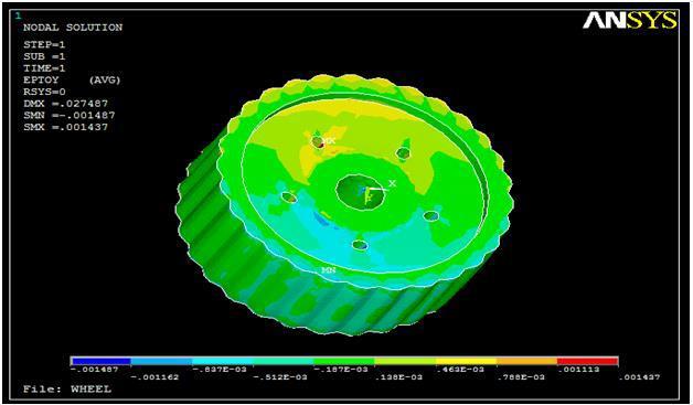 As shown above figures, we are considering the AnalysisresultsofFrame,WheelandCuttertheofAgribotas it is the major working component in the project, so the displacementofthedesignismeshedandsolvedusingAnsys anddisplacement,whichisveryless.