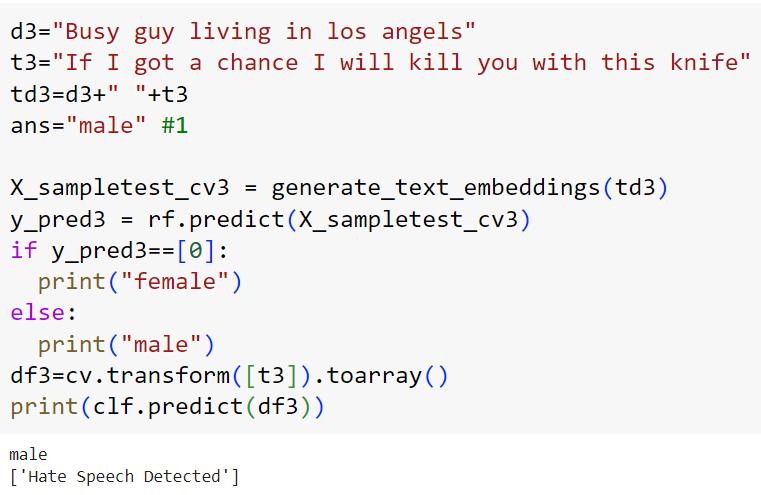 To further validate the performance of the model, it wastestedusingasetoftweets.Duringtesting,the model analysedthetextualcontentofthesetweetsandprovided predictions regarding whether each tweet contains hate speechornot.Thepredictedoutputfromthemodelserves as an indication of its ability to generalize and make accuratepredictionsonnew,unseendata.