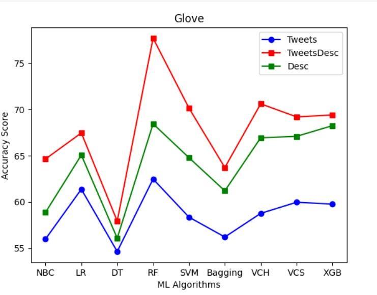 After preprocessing, multiple machine learning algorithmsaretrainedontheGloVeembeddingstopredict thegenderofsocialmediausers.Thesealgorithmsinclude NaiveBayes(NB),LogisticRegression(LR),DecisionTrees (DT), Random Forests (RF), Support Vector Machines (SVM), Bagging, Voting Classifier Hard (VCH), Voting Classifier Soft (VCS), XGBoost (XGB), and others. Each algorithm learns from the patterns present in the GloVe embeddings to classify social media users into different gendercategories.