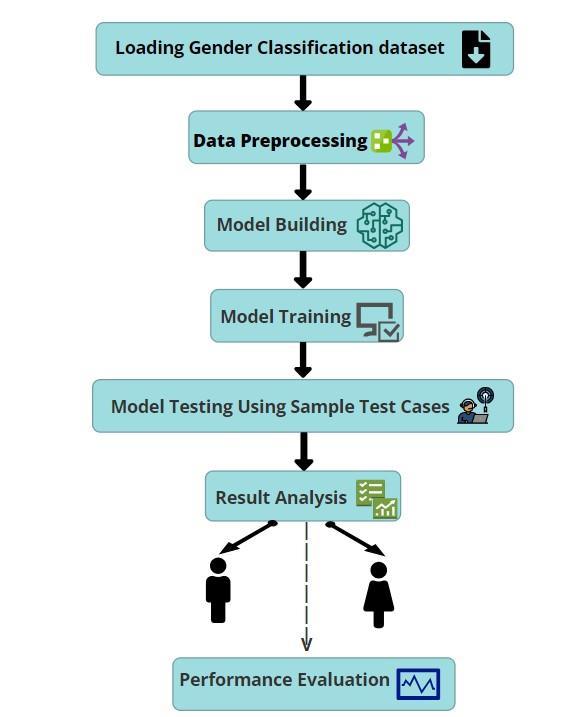 Followingthetrainingphase,theperformanceofeach machinelearningalgorithmisevaluatedusingaccuracyas the primary metric. Accuracy measures the percentage of correctly classified instances of gender prediction. Additionally, other evaluation metrics such as precision, recall, and F1-score may also be calculated to assess the models'performancecomprehensively.