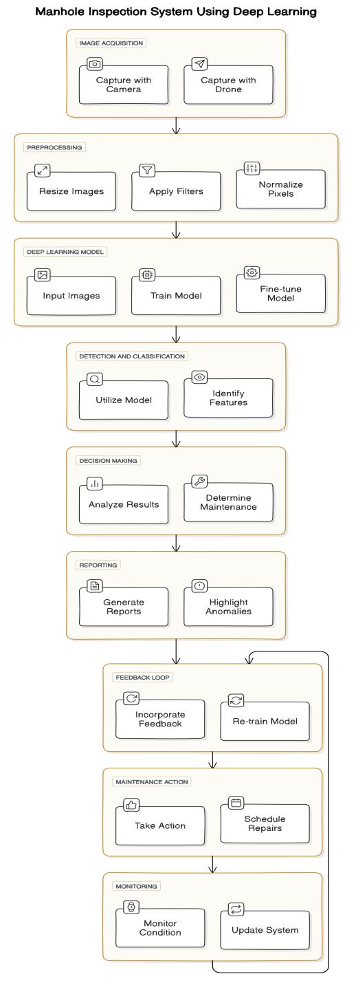 Continual iteration is key to refining the system. This involves gathering feedback from field deployments, updating the model with new data and insights, and enhancing the system's performance and reliability over time.Byadheringtothisframework,onecancreatearobust manholevisualinspectionsystemusingdeeplearning.Such asystemaidsmunicipalitiesandinfrastructuremanagement organizations in maintaining and monitoring manholes efficiently, resulting in improved safety and reduced maintenancecosts.