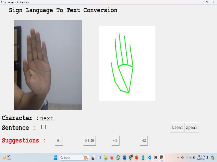 Furthermore,thesystemisequippedwithahighlyintuitive Graphical User Interface (GUI) that showcases the captured video feed and the recognized hand sign, providing users with a seamless experience to interact with the system effortlessly. Users are presented with an array of options, including the ability to select suggested words or effortlessly clear the recognized sentence, fostering an environment of interactive and dynamic communication. Additionally, the integration of text-tospeech functionality empowers users to not only visualize but also audibly comprehend the recognized sentence, enhancingtheoverallaccessibilityanduserexperience.